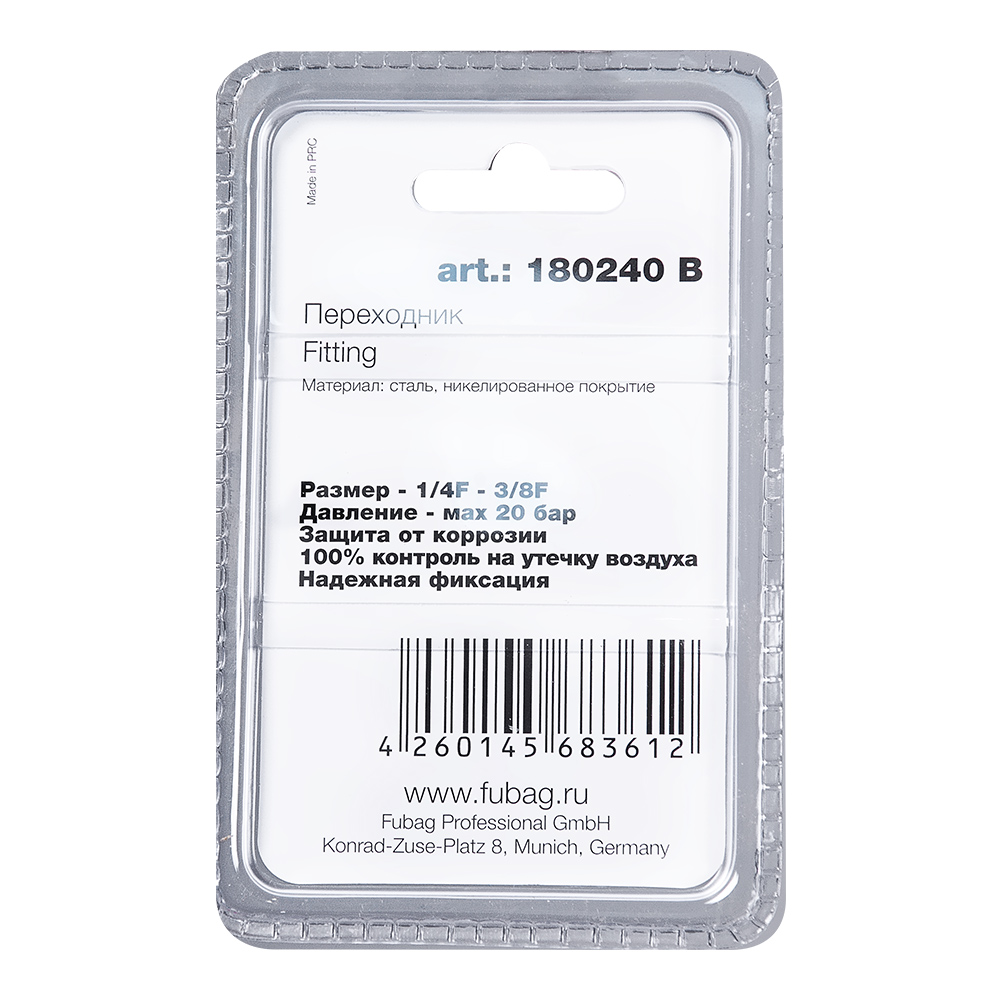 Характеристики FUBAG Переходник 1/4 дюйма F - 3/8 дюйма F, блистер 1 шт